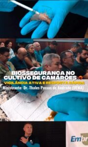 Além da palestra, o Prof. Thales também foi o responsável por ministrar o curso “Biossegurança no Cultivo de Camarões – Vigilância Ativa e Resposta Rápida”, realizado no 28 de novembro. O curso, que teve como público-alvo produtores, técnicos e alunos da área de aquicultura, focou na importância da biossegurança para a detecção precoce de surtos de doenças e para a manutenção de cultivos de camarão saudáveis. O treinamento incluiu módulos sobre a inspeção de sinais clínicos, uso correto de kits de coleta e fixação, e a criação de planos de ação para resposta rápida a surtos sanitários.
